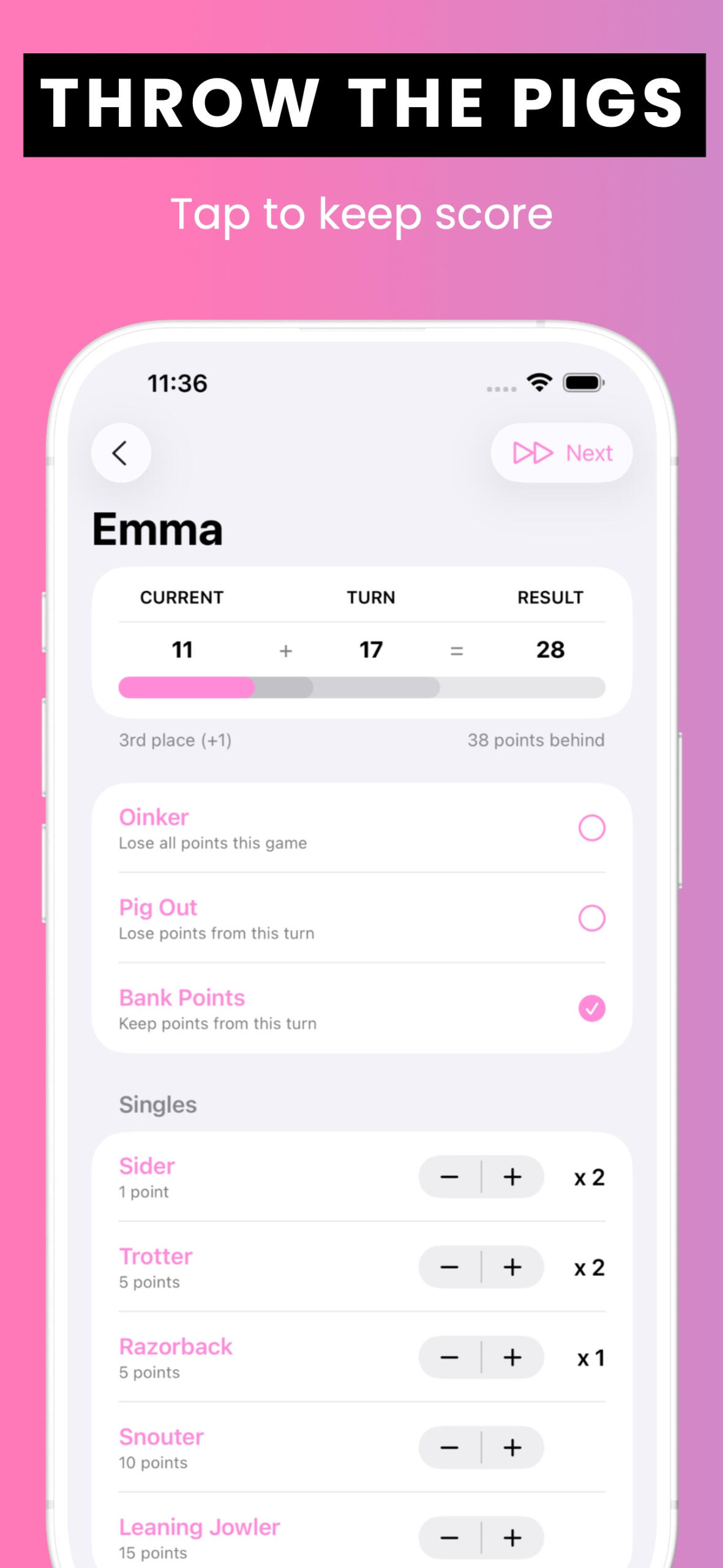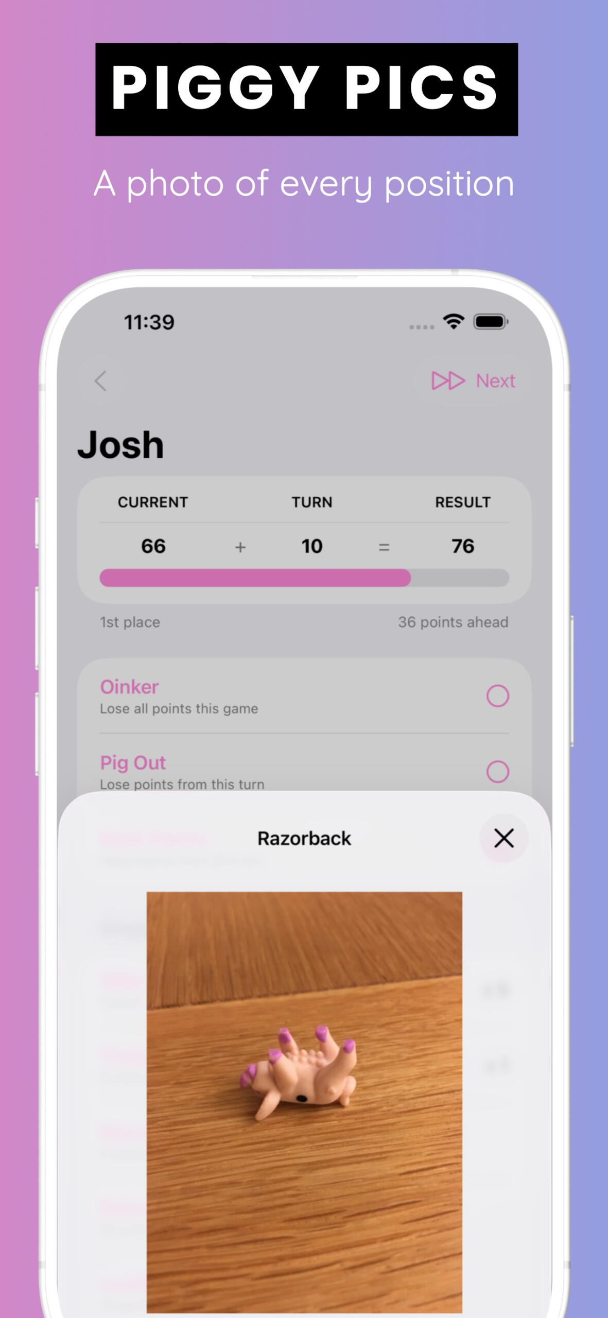 "Snout wrong with this app! Fantastic simple app. Makes Pass the Pigs much less taxing for tired old brains and adds a tech angle for young brains. Thank you!"